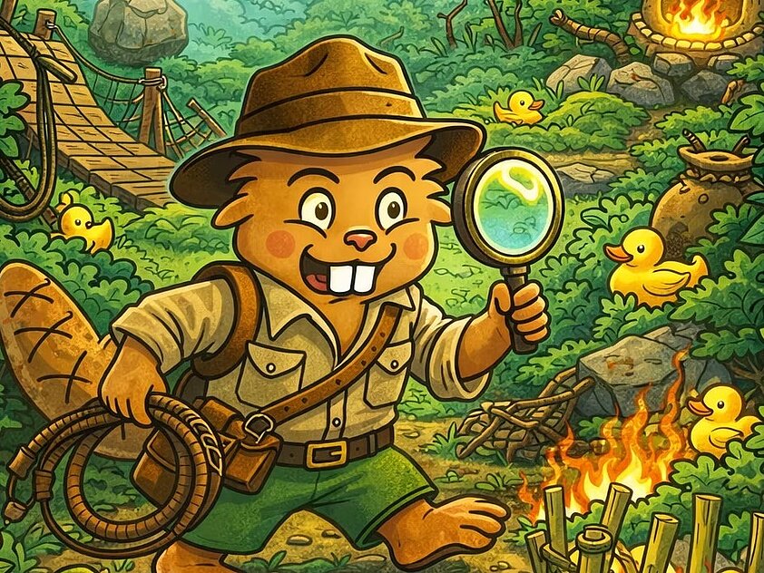 Bibo, der schlaue Biber, setzte seinen Abenteurerhut auf, schnappte sich seine Lupe und sagte laut:„Quak-Alarm! Die 10 geheimnisvollen Goldenten sind verschwunden!“